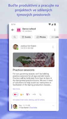 Spolupráca na projektoch a plánoch je s **Microsoft Teams** jednoduchšia ako kedykoľvek predtým. Rýchlo a bez námahy zdieľajte dôležité okamihy prostredníctvom fotografií a videí priamo v chatoch. Využívajte cloudové úložisko pre okamžitý prístup k zdieľaným dokumentom a súborom, nech už ste kdekoľvek. Organizujte zdieľaný obsah – udalosti, fotky, odkazy a súbory – v rámci komunity, aby ste eliminovali stratu času hľadaním. Využite vaše stretnutia naplno s funkciami ako zdieľanie obrazovky, interaktívna tabuľa či rozdelenie do virtuálnych miestností. Majte prehľad o úlohách a termínoch vďaka zoznamom úloh, kde môžete prideľovať úlohy a sledovať ich plnenie, čím udržíte všetkých v obraze.