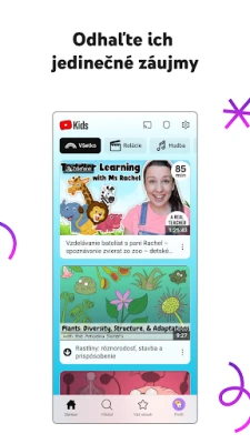 Pretože každé dieťa je jedinečné, YouTube Kids umožňuje plné prispôsobenie diváckeho zážitku. Rodičia môžu ľahko nastaviť individuálne profily s vlastnými filtrami obsahu, čím zaisťujú, že ich deti sledujú len to, čo je pre ne vhodné a podporuje ich rozvoj. Či už vaše dieťa patrí medzi zvedavých Predškolákov túžiacich po základných vedomostiach, objavuje pesničky a rozprávky v režime Mladšie deti, alebo hľadá obľúbenú hudbu a herné videá ako Staršie deti, YouTube Kids ponúka presne cielený obsah. Pre maximálnu kontrolu je k dispozícii aj možnosť Ručne schvaľovaného obsahu, kde môžete vyberať konkrétne videá, kanály a zbierky.